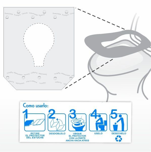 Producto de primera necesidad para usar como protector higiénico en la tapa de los sanitarios de servicio público. Impermeable, higiénico y desechable.
